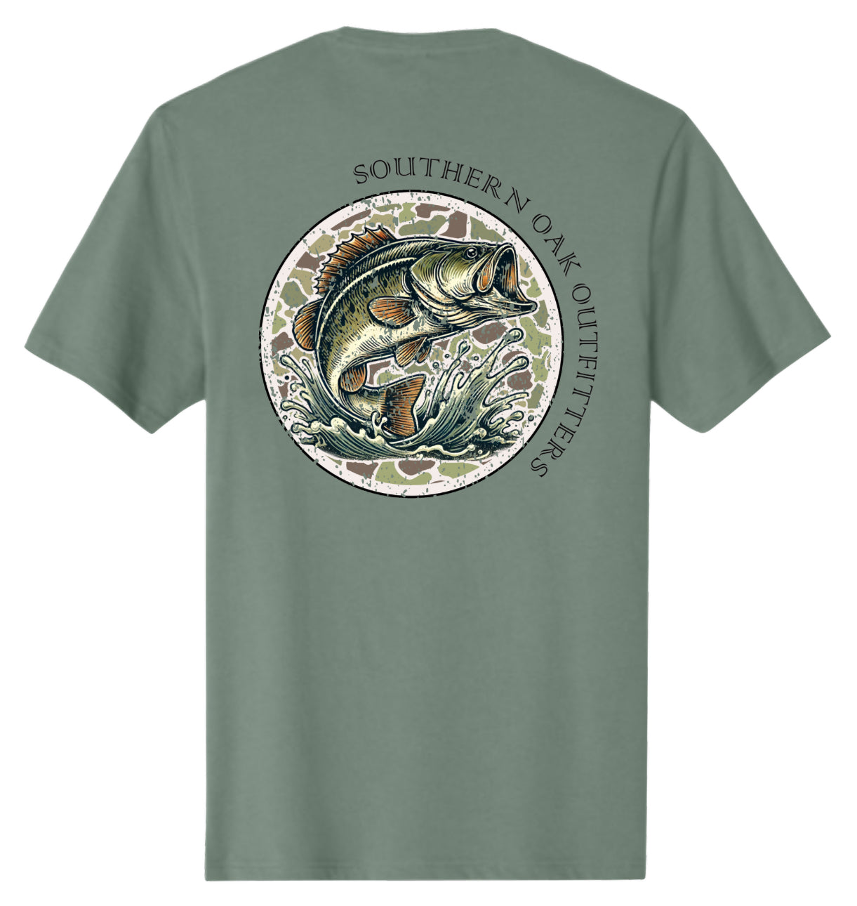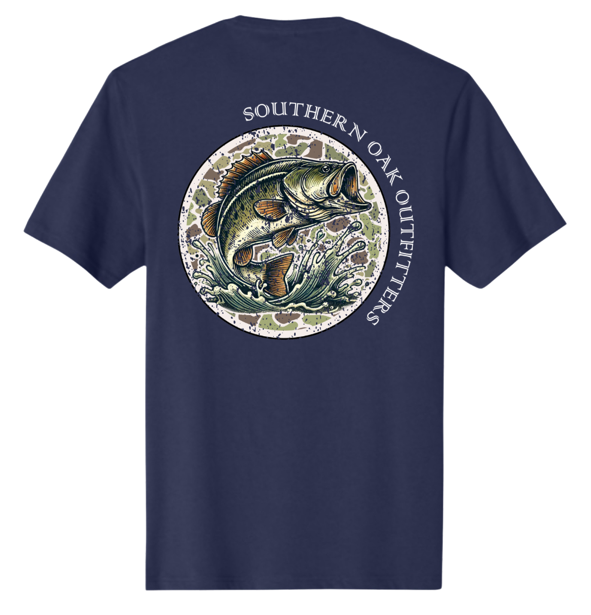 Introducing our Retro Bass T-shirt, perfect for any outdoor enthusiast. This tanzanite blue short-sleeve tee features a retro camo circle on the back with a bass design, blending classic style with a love for fishing. The tagless design ensures maximum comfort, with the logo and size stamped inside the shirt. A United States flag is proudly stamped on the arm, and the front sports our signature logo. Available in sizes for both children and adults, this durable and stylish T-shirt is a must-have for your next adventure.