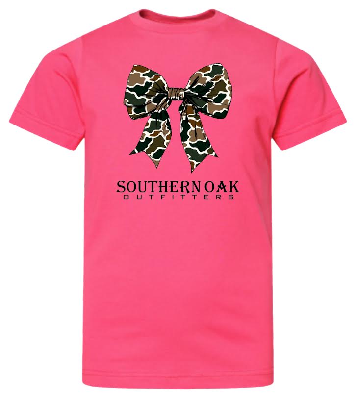 Say hello to the Retro Bow Tee, the perfect top for adventurous kids! This hot pink T-shirt features a super cute retro camo-filled bow on the front, adding a fun and stylish twist. Made for comfort and durability, it's ideal for all their outdoor escapades. Let your little ones stand out and show off their playful side with this adorable tee!
